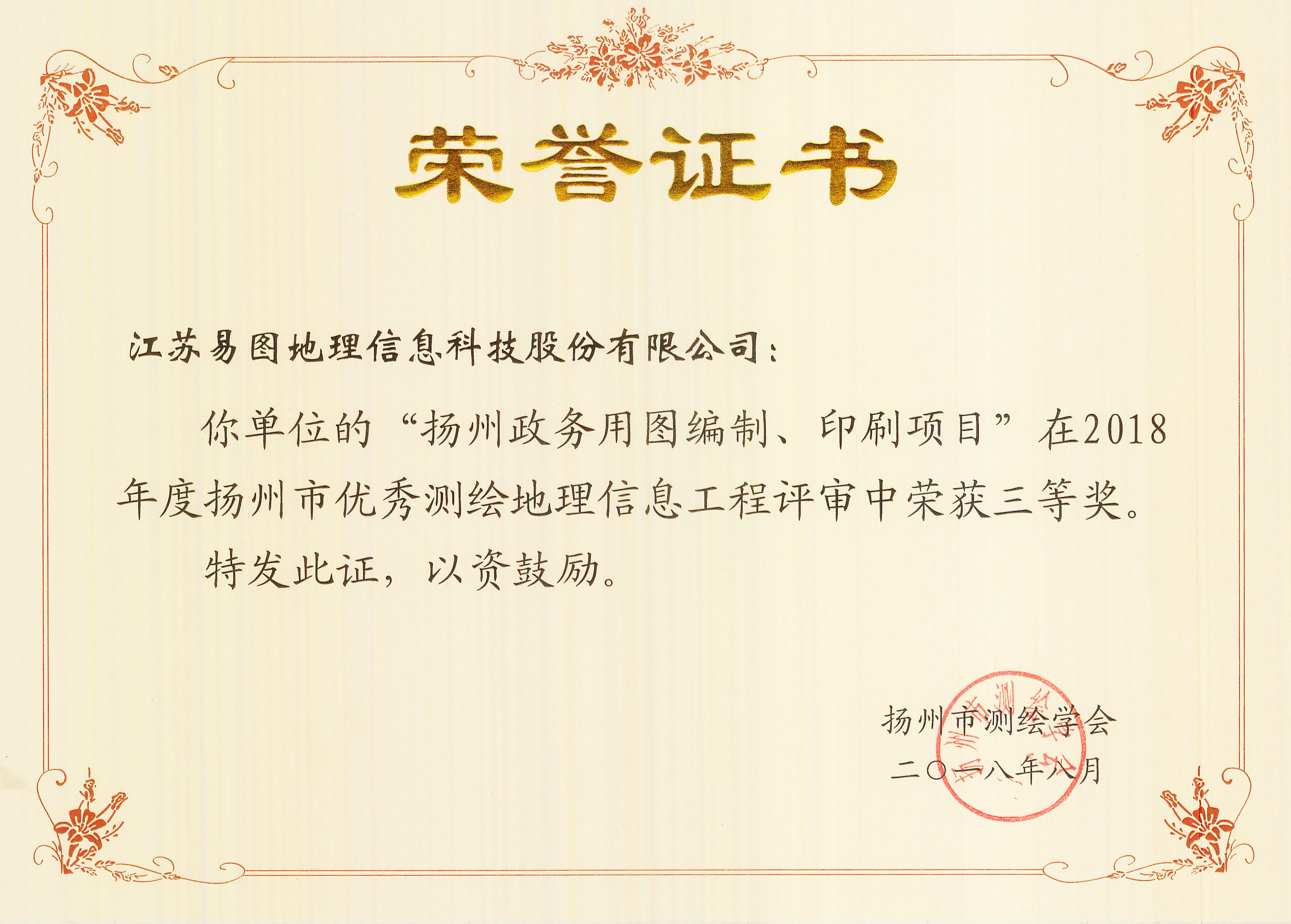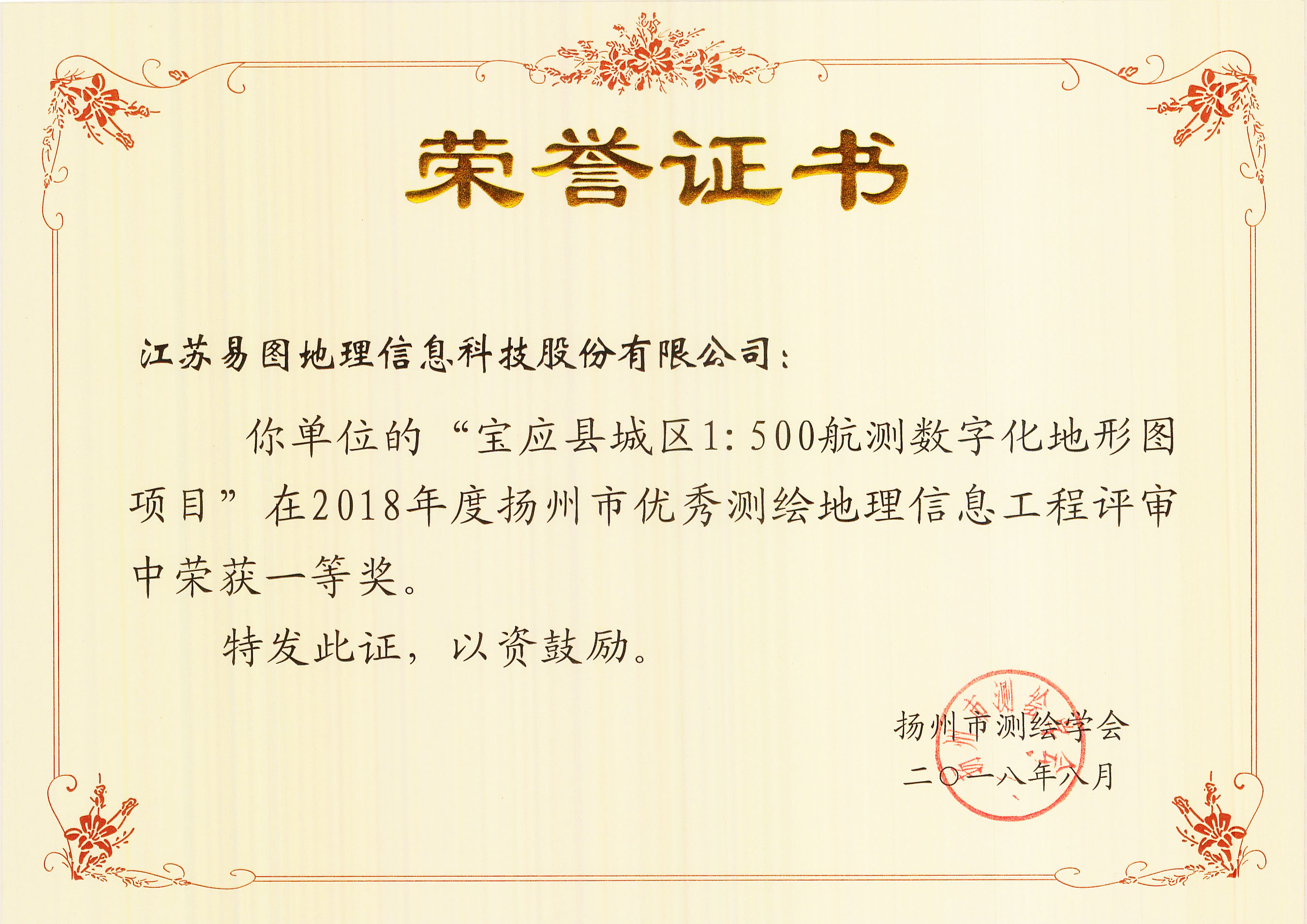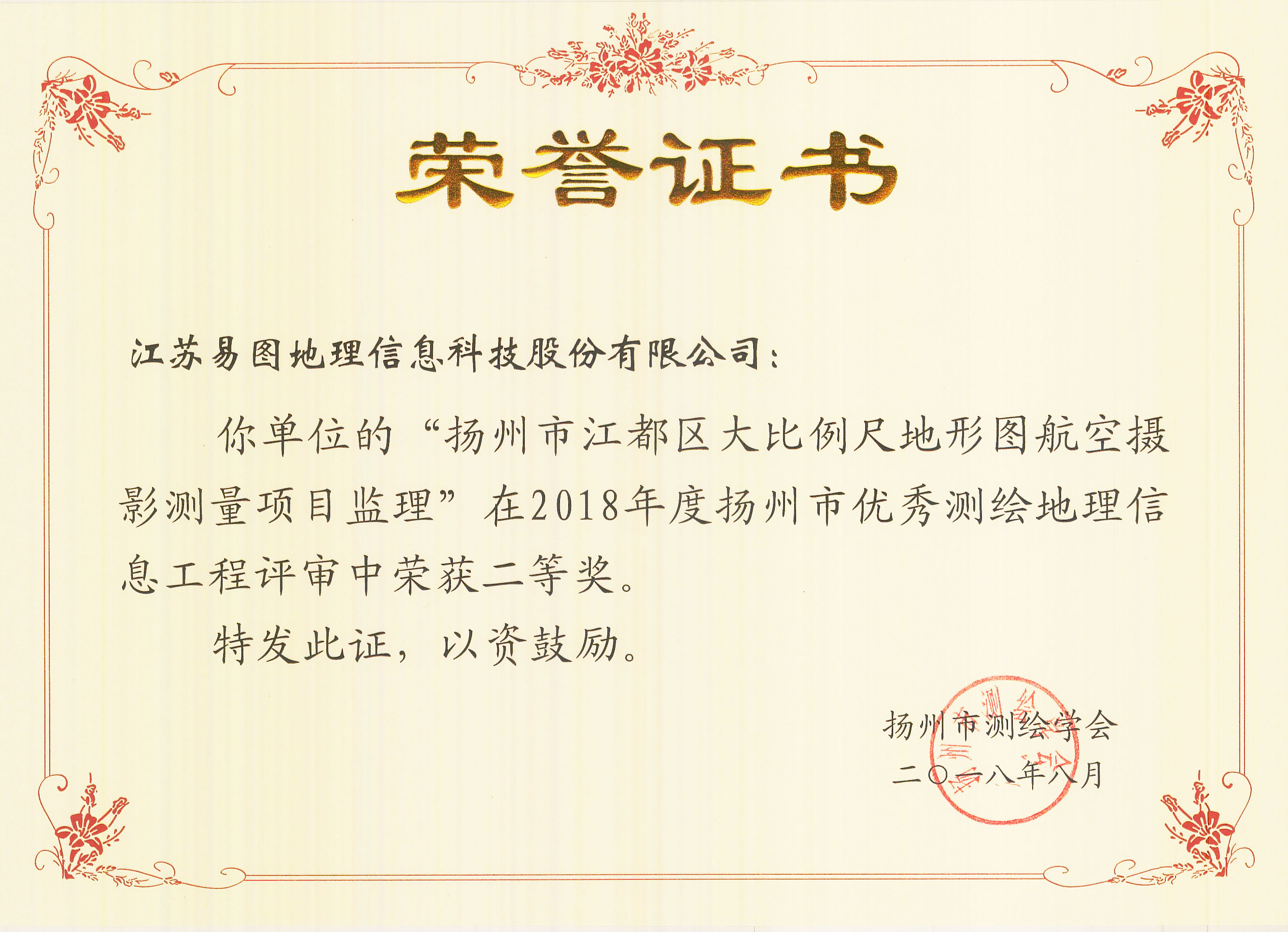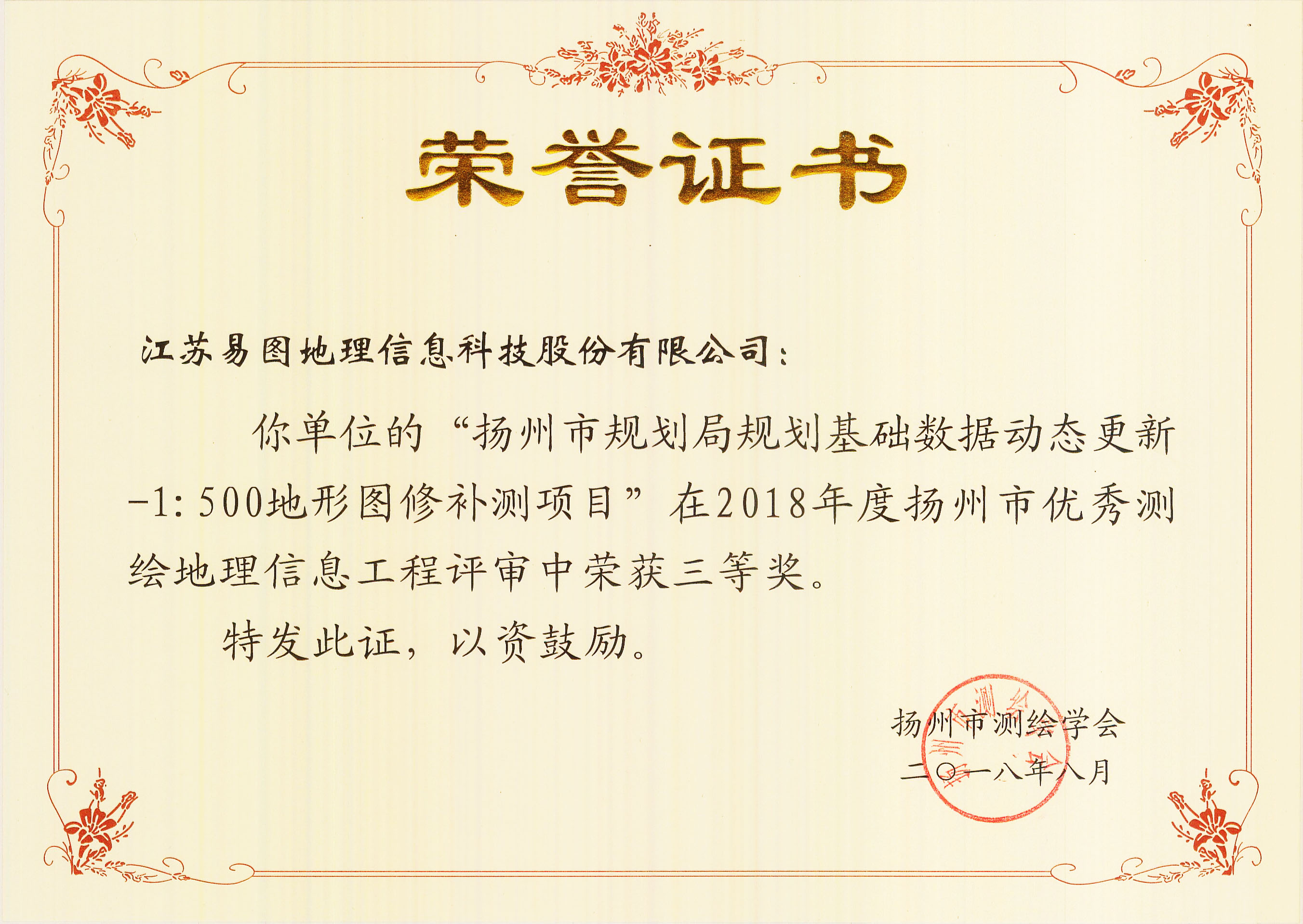 日前,揚(yáng)州市測繪學(xué)會開展了2018年度全市優(yōu)秀測繪地理信息工程的評選工作。江蘇易圖地理信息科技股份有限公司很榮幸有多項(xiàng)獲獎,可喜可賀!這些榮譽(yù)無疑為我們今年的高速發(fā)展打了一劑強(qiáng)心劑。