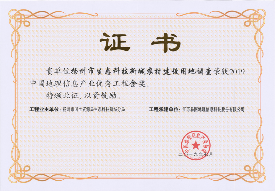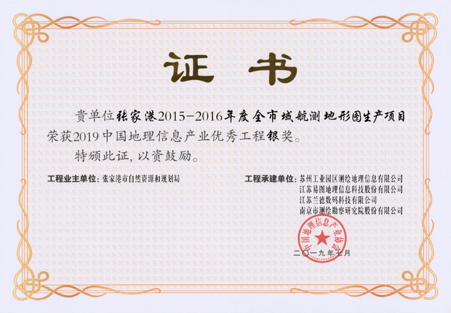 江蘇易圖地理信息科技股份有限公司憑借穩步增長的業績和突出的人才技術實力,連續三年入圍“中國地理信息產業百強企業”榜單。同時“揚州市生態科技新城農村建設用地調查項目”入圍“2019中國地理信息產業優秀工程金獎”;“張家港2015-2016年度全市域航測地形圖生產”項目榮獲“2019中國地理信息產業優秀工程銀獎”。
