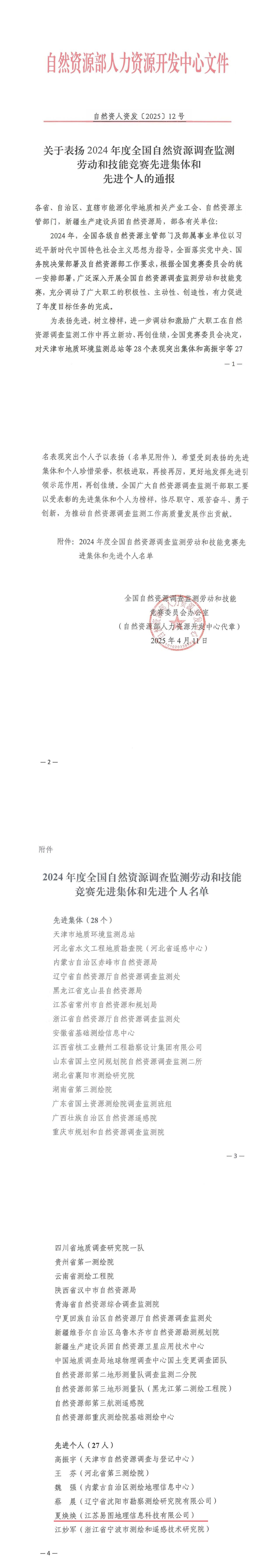 4月11日,自然資源部人力資源開發中心印發《關于表揚2024年度全國自然資源調查監測勞動和技能競賽先進集體和先進個人的通報》,我司夏煥煥同志獲評2024年度全國自然資源調查監測勞動和技能競賽先進個人,展現了我司自然資源調查監測工作者的風采。