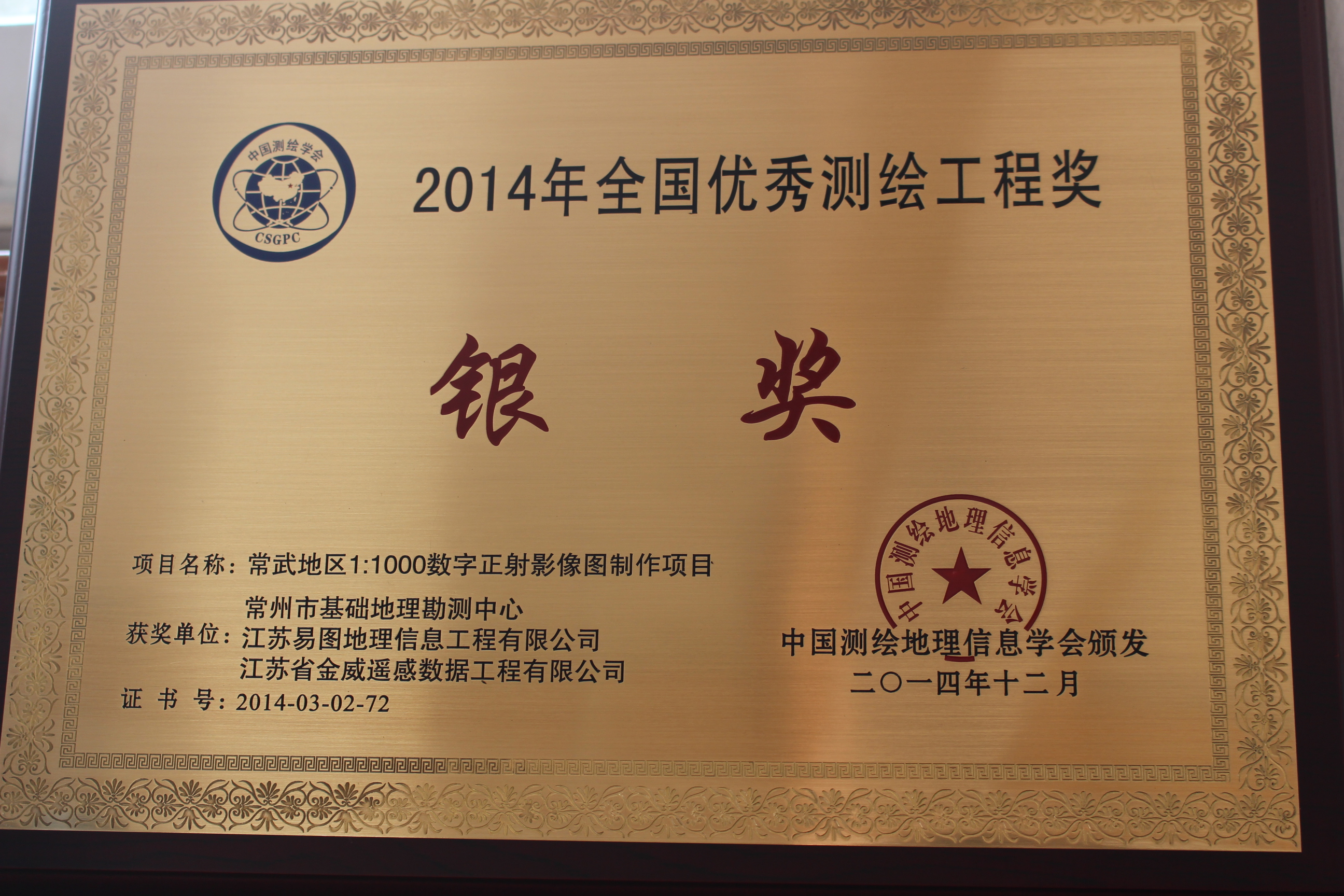 20141217,中國測繪地理信息學會在武漢舉行2014年測繪科技進步獎、全國優秀測繪工程獎、優秀底圖作品裴秀獎頒獎大會。我公司參與制作的《常武地區1:1000數字正射影像圖制作項目》獲得2014年全國優秀測繪工程獎。