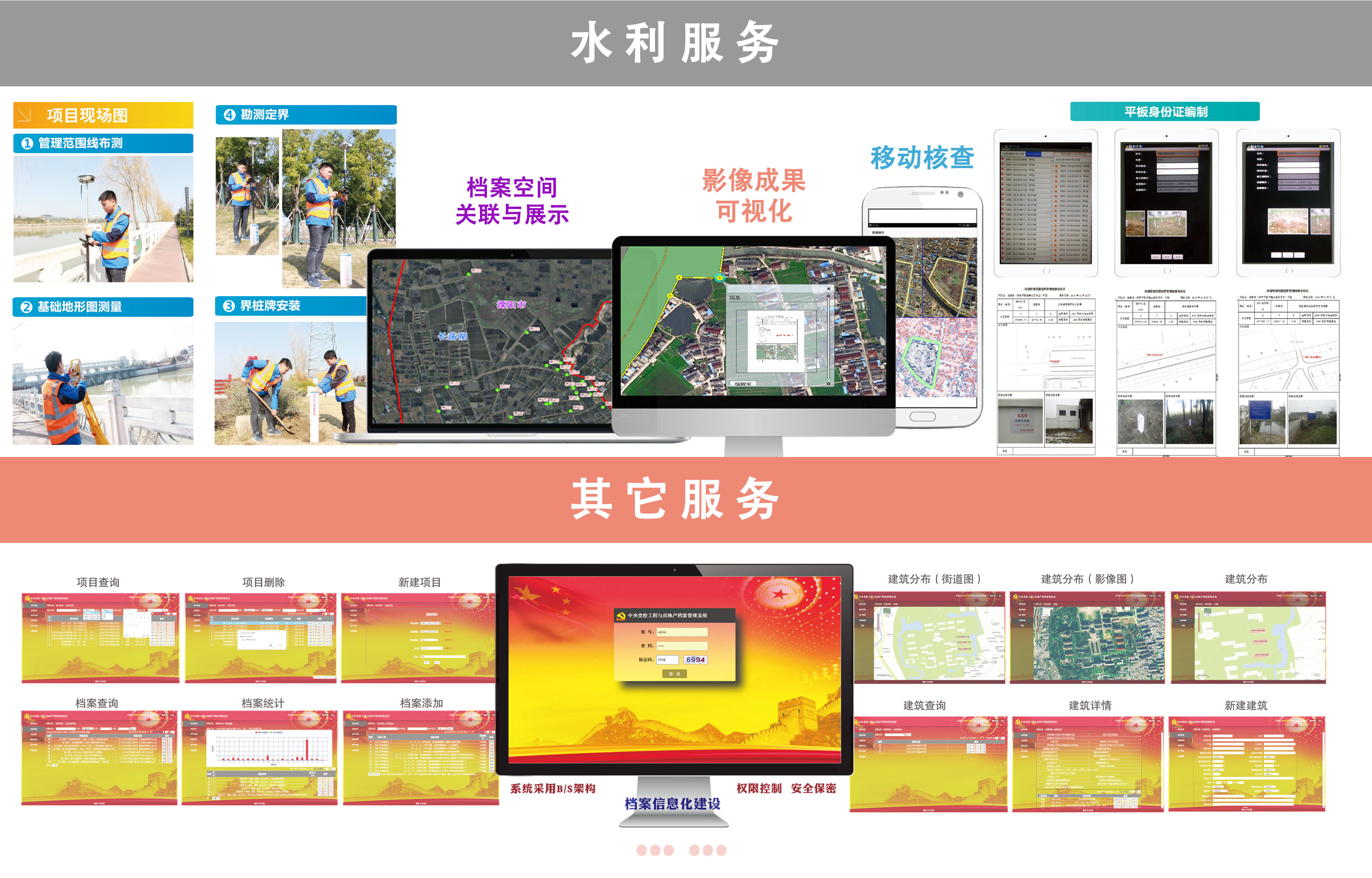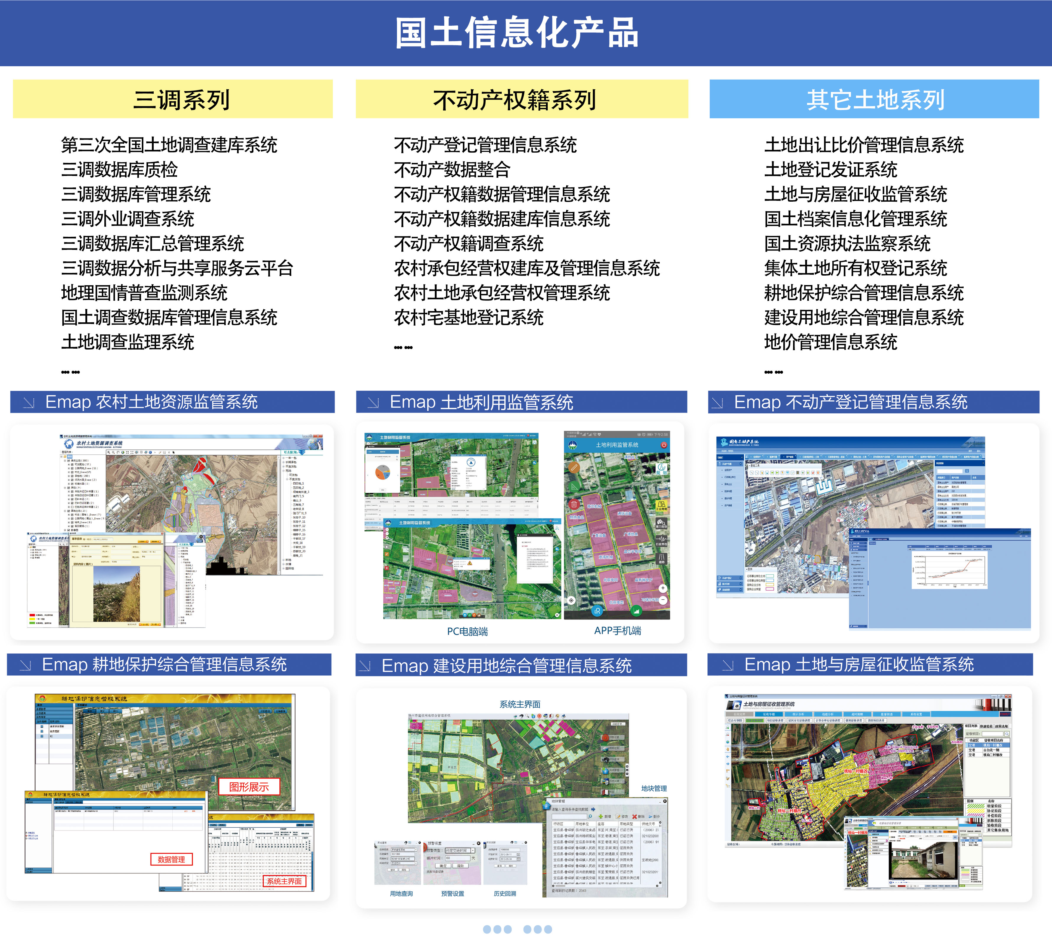 本公司提供專題地理信息系統(tǒng)研發(fā)服務(wù),目前已擁有獨(dú)立自主研發(fā)的軟件著作權(quán)近60項(xiàng),其中,國土類專題研發(fā)系統(tǒng)包含:國土信息化產(chǎn)品很多:三調(diào)系列(第三次全國土地調(diào)查建庫軟件、三調(diào)數(shù)據(jù)庫質(zhì)檢軟件、三調(diào)數(shù)據(jù)庫管理系統(tǒng)、三調(diào)外業(yè)調(diào)查系統(tǒng)軟件、三調(diào)數(shù)據(jù)庫匯總管理系統(tǒng)軟件、三調(diào)數(shù)據(jù)分析與共享服務(wù)云平臺(tái)系統(tǒng)軟件、地理國情普查監(jiān)測(cè)系統(tǒng)等)、不動(dòng)產(chǎn)權(quán)籍系列(不動(dòng)產(chǎn)登記管理信息系統(tǒng)、不動(dòng)產(chǎn)數(shù)據(jù)整合軟件、不動(dòng)產(chǎn)權(quán)籍?dāng)?shù)據(jù)管理信息系統(tǒng)軟件、不動(dòng)產(chǎn)權(quán)籍?dāng)?shù)據(jù)建庫信息系統(tǒng)軟件、不動(dòng)產(chǎn)權(quán)籍調(diào)查系統(tǒng)軟件)、集體土地所有權(quán)登記系統(tǒng)、耕地保護(hù)綜合管理信息系統(tǒng)、建設(shè)用地綜合管理信息系統(tǒng)、土地出讓比價(jià)管理信息系統(tǒng)、土地登記發(fā)證系統(tǒng)、農(nóng)村土地承包經(jīng)營權(quán)管理系統(tǒng)、農(nóng)村宅基地登記系統(tǒng)、國土檔案信息化管理系統(tǒng)、國土調(diào)查數(shù)據(jù)庫管理信息系統(tǒng)、自然資源監(jiān)督平臺(tái)、國土資源執(zhí)法監(jiān)察系統(tǒng)、土地與房屋征收監(jiān)管系統(tǒng)、土地調(diào)查監(jiān)理系統(tǒng)、地價(jià)管理信息系統(tǒng)、農(nóng)村承包經(jīng)營權(quán)建庫及管理信息系統(tǒng)、... ...